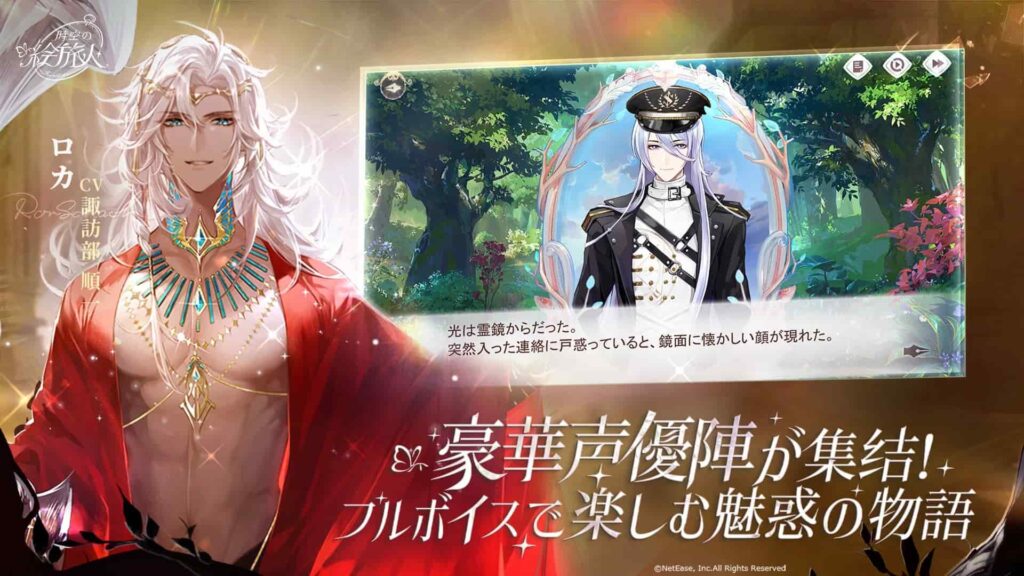 時空の絵旅人はNetEaseが配信している女性向けアプリ。豪華声優によるフルボイスかつ100万文字以上の超大作ストーリーが特徴です。パラレルワールドをテーマに異なる世界を渡り歩く主人公は、それぞれの世界で「彼」らと巡り会い絆を育みます。