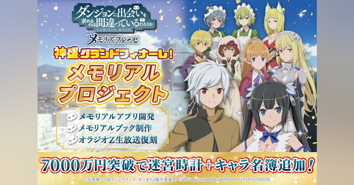 なおメモリアルアプリの開発費、メモリアルブックの制作、ラジオの復刻などをメインとしたクラウドファンティングを発表。開始30分で1000万円を超える寄付が集まっている。原作者大森氏のサイン入り全部特盛り返礼品(145000円)が爆速で在庫なし。それ以外にも多くの返礼品が選ばれていてダンまち及びダンめもがファンに愛されているのがよくわかる。