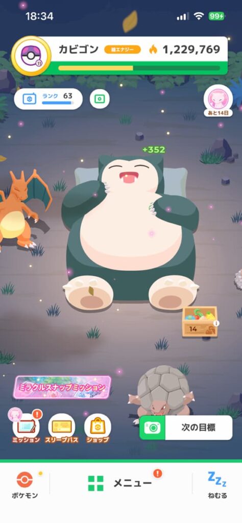 眠って起きることで側にポケモンがよってきて、お手伝いポケモンとなりうるポケモンを捕まえる。捕まえてカビゴンの世話をするお手伝いポケモンを育成していきます。育成はガチな人向けなので、ただひたすら睡眠計測に使うだけでも問題ないですよ✨️