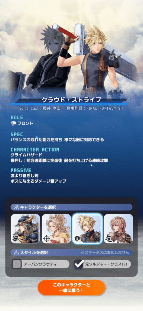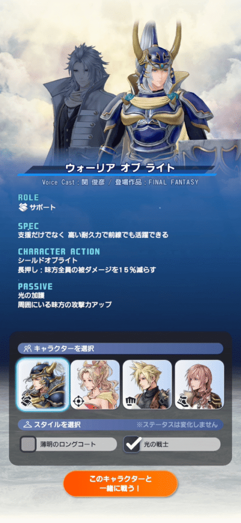 最初に使用できるキャラはウォーリア・オブ・ライト、ティナ、クラウド、ライトニングの4人から選択できる。スタイルは見た目が変わるだけなので好きなほうを選ぼう。なおこの4人はチュートリアルシーズンの報酬で手に入るので選ばなかったらなかなか手に入らないのでは、というのではないのでご安心を。
