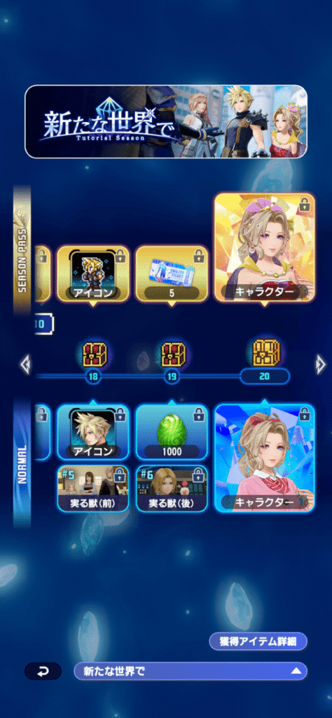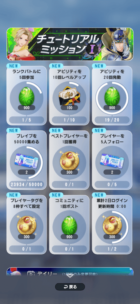 事前登録報酬は一度にもらえるのではなく、7日間に分けて配布されるパターン。シーズンパス限定でガチャチケ20枚もらえるので余裕がある人はパス課金してもよいかも。チュートリアルミッションは簡単なものから難しいものまであるけど、使用キャラによっては真ん中の「ベストプレイヤーを1回獲得」の達成が難しいと思う。