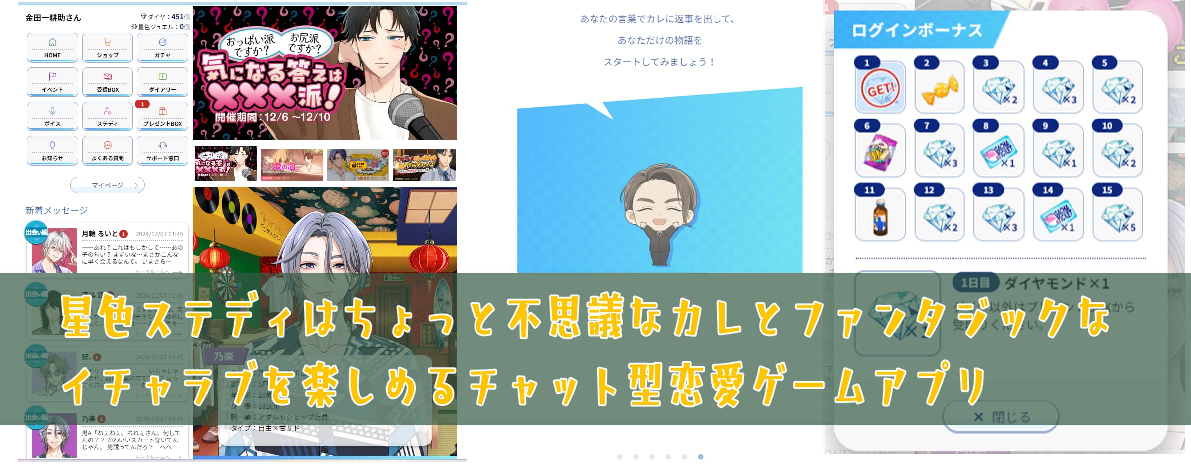 「星色ステディ」は選択肢を選んでストーリーを楽しむ従来の乙女ゲームとは違い、チャット画面で自分の言葉で会話しながらあなただけの恋愛を楽しむチャット型恋愛ゲームアプリです。今大流行中の形式です。