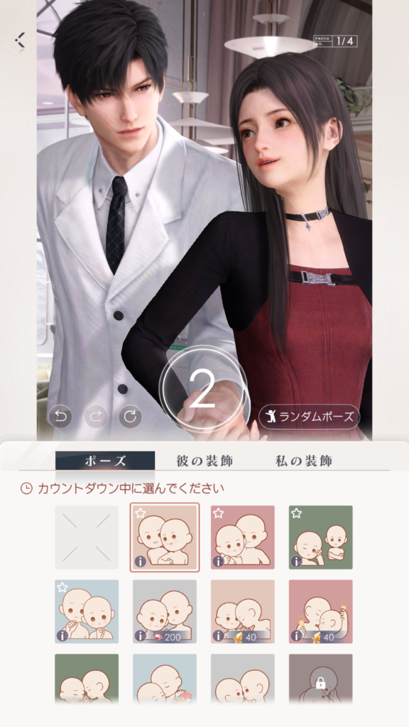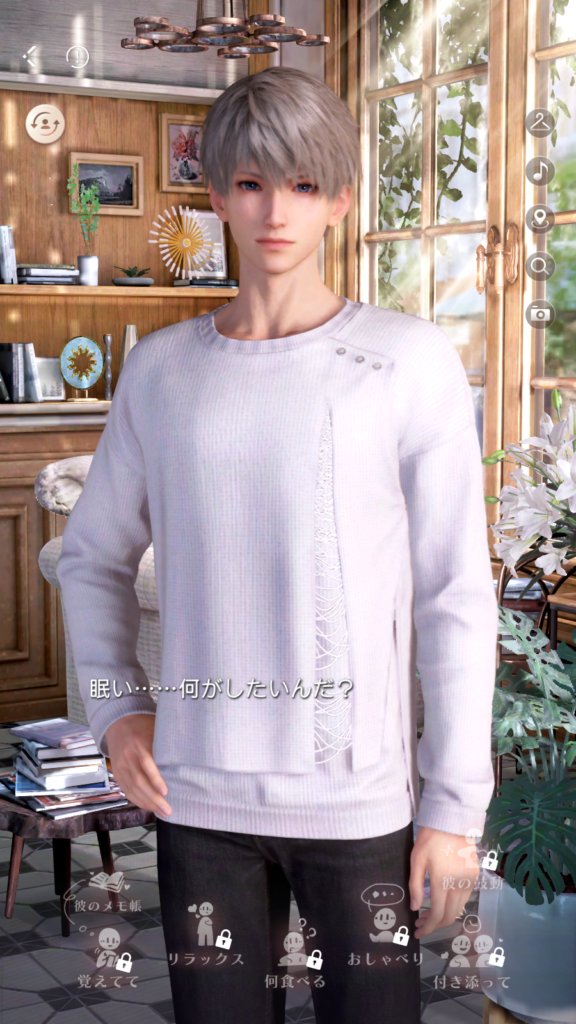 「デート」という機能で写真を撮ったり、彼とのいちゃあまストーリーを読むことができます。好感度は「絆」で表記され、絆が一定以上たまると専用ストーリーが解放されます。