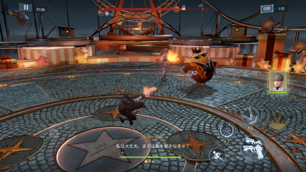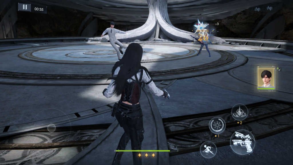バトルはそれまでの縦持ちから横持に変化。左に仮想パッド、右側にコマンドボタンのオーソドックスな配置のバトルゲームです。攻撃と回避を駆使し、ゲージがたまったら共鳴技を叩き込むのが基本。基本的には主人公一人ではなくパートナーとなる彼との二人三脚で戦います。