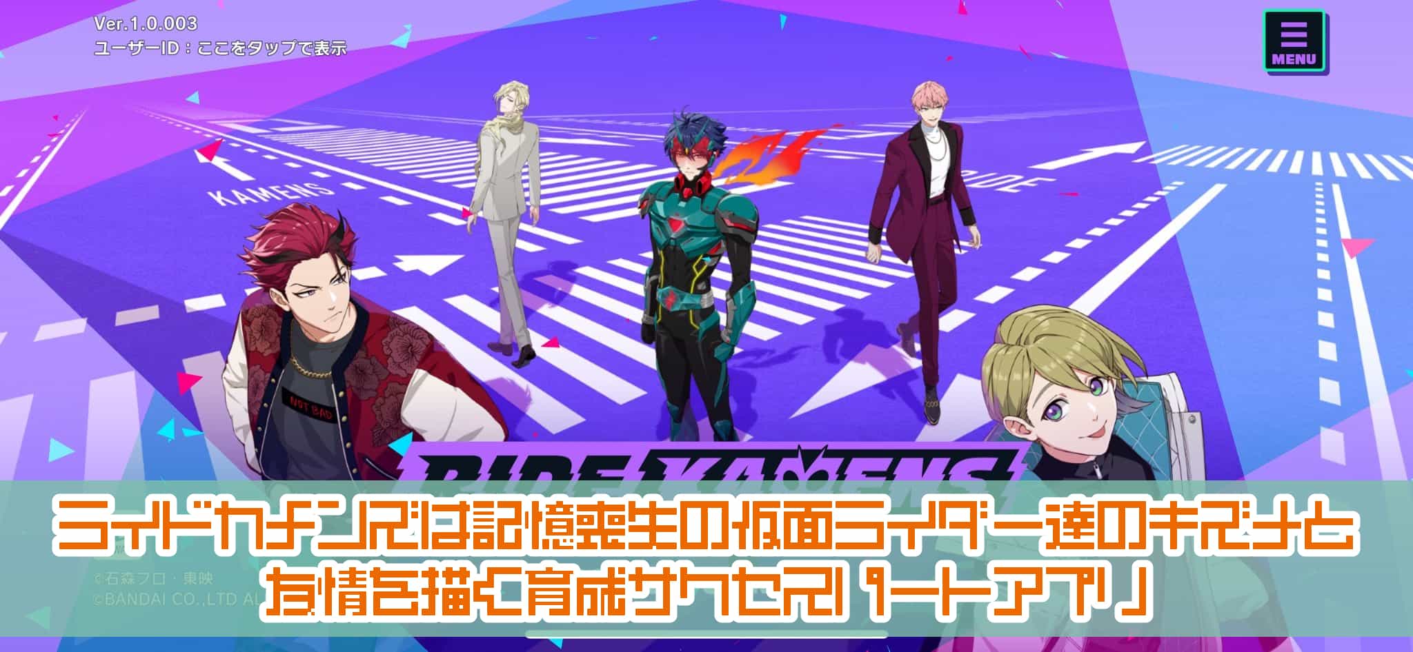 2024年5月30日の18時にリリースした「ライドカメンズ」はバンダイナムコとリベルによる女性向け育成アプリ。昭和から令和にかけて圧倒的知名度を誇る「仮面ライダー」をモチーフにしたアプリ。登場する仮面ライダーたちにはそれぞれモチーフになった作品があるが、見ていればなるほどというレベルであり見ていなくても普通に楽しめる程度。そもそも作品の話数も長いし。