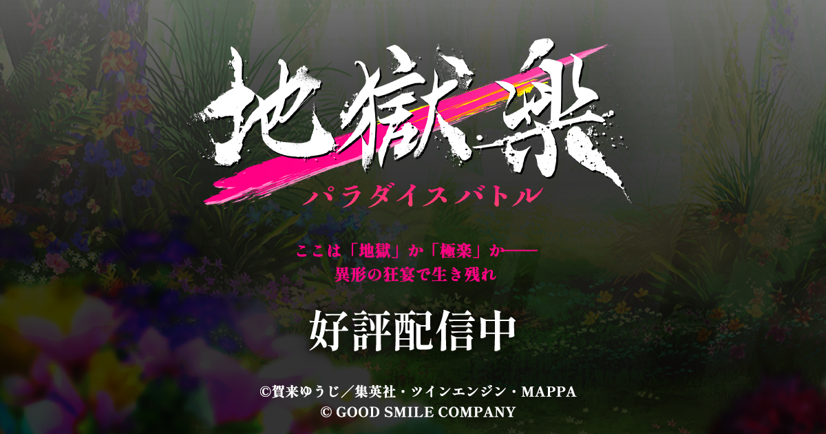 人気漫画「地獄楽」初のスマホアプリゲーム。アニメ脚本家がストーリー監修を務めている。ストーリーはゲームオリジナルもあり、基本はフルボイス。スマホ以外ではDMMでも遊べる。事前登録者は15万人を突破し、20連分のガチャ石と、好きな追想(概念礼装みたいなもの)が1枚貰える。